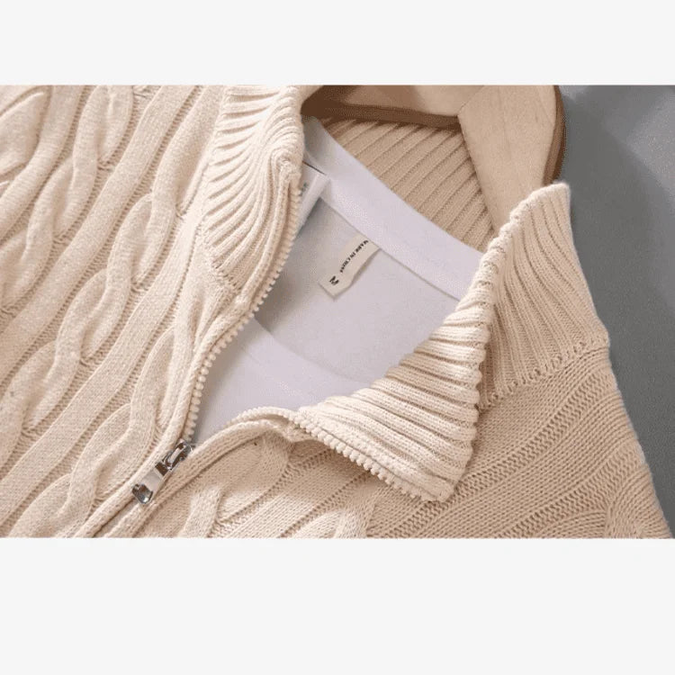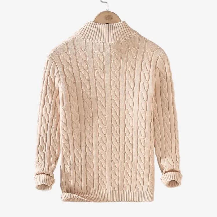 Com trama trançada em relevo, gola alta com zíper e acabamento impecável, o suéter combina estilo clássico com um toque moderno. Sua cor Bege neutra traz versatilidade, facilitando combinações com calças jeans, chinos ou até sobreposição em looks casuais mais elegantes.