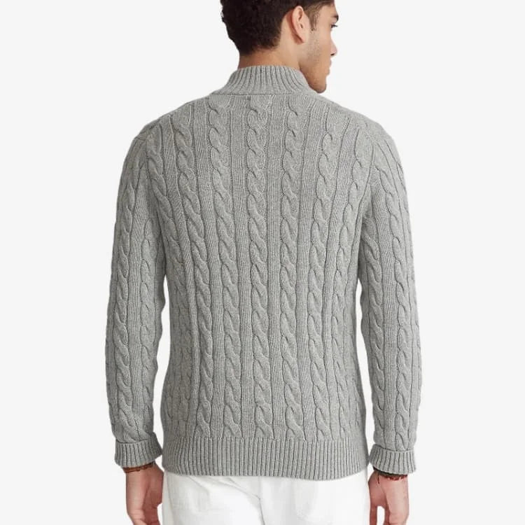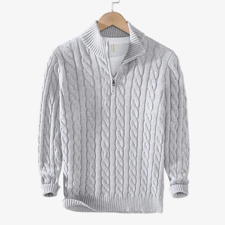 Com trama trançada em relevo, gola alta com zíper e acabamento impecável, o suéter combina estilo clássico com um toque moderno. Sua cor cinza neutra traz versatilidade, facilitando combinações com calças jeans, chinos ou até sobreposição em looks casuais mais elegantes.